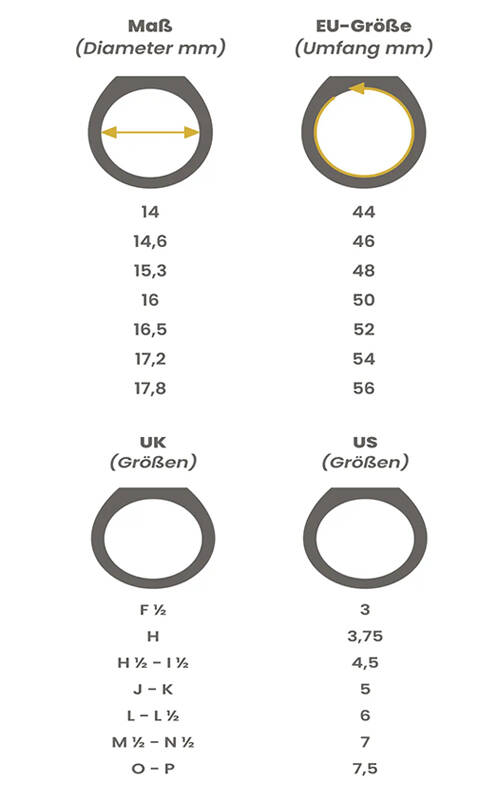 Entscheidend für einen perfekt Ring ist neben der Optik des Ringes, das richtige Maß. International werden hier verschiedene Größen – ähnlich wie bei Schuhen – verwendet. In Deutschland stellte traditionell der Durchmesser des Ringes in mm die Ringgröße dar. In den letzten Jahrzehnten hat sich aber der Umfang des Fingers in mm als Größe durchgesetzt. In der nachfolgenden Tabelle erhalten Sie einen Überblick (Auszug) verschiedener Größen.